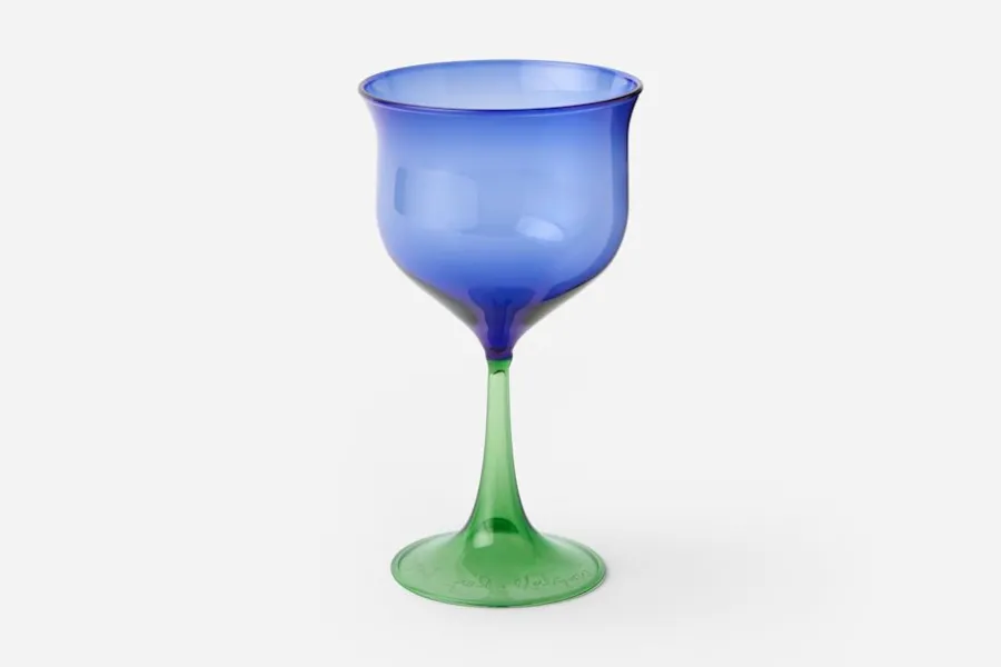 Blågrönt, handblåst vinglas med vacker, tulpanliknande form. Glaset hör till Londonbaserade designstudion Campbell-Reys kollektion Cosimo. Det är tillverkat i Murano, men unikt då det är blåst i Pyrexglas istället för i klassiskt Muranoglas. Cosimo kombinerar traditionell venetiansk glasblåsning med de praktiska attribut som hör Pyrex till. Det är mer slitstarkt och värmetåligt, och går därför att diska försiktigt i maskin.