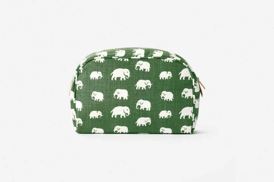 Både vacker och praktisk är necessären, med dragkedja i mässing och mönster av Estrid Ericson. Svenskt Tenns grundare reste mycket och tog ofta med sig olika mönster, former och souvenirer hem. Det var efter en förlaga från Belgiska Kongo som hon formgav mönstret med de små elefanterna. Textil Elefant trycktes för första gången i slutet av 1930-talet.