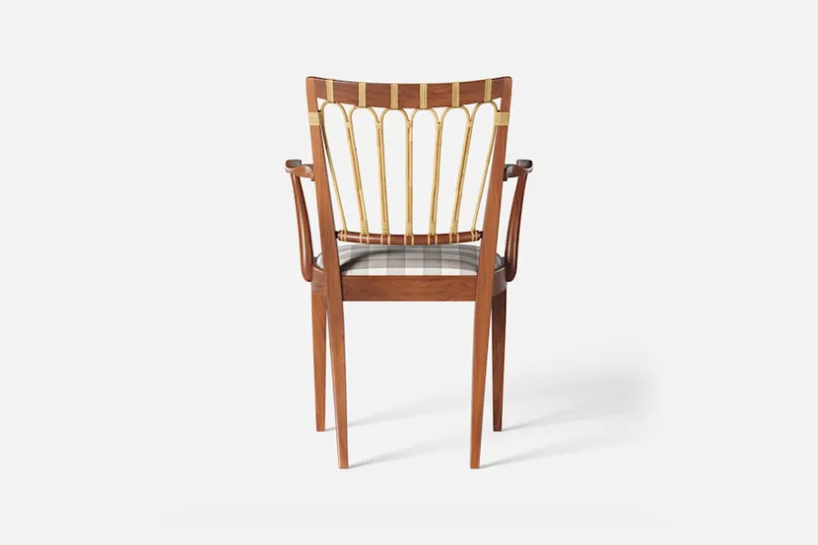 Efter sin återkomst till Stockholm från New York år 1946, formgav Josef Frank denna eleganta karmstol. Stolen har en genombruten rygg bestående av lindad rotting. För att skapa spänning i formen valde Josef Frank ofta att blanda olika träslag och material.