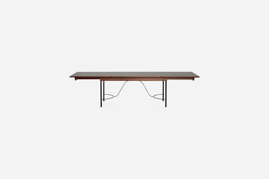 Josef Frank formgav Matbord 884 år 1938. Att blanda olika material var typiskt för Josef Franks formgivning. Här möter skivan i lackat linoleum och valnöt ett stativ av järn med avslutning av mässingsfötter.