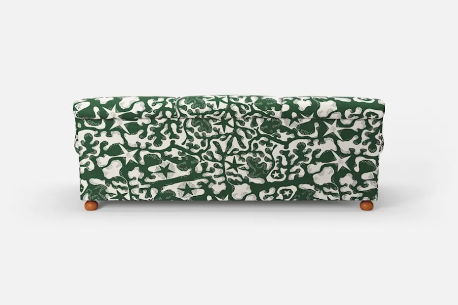 Josef Frank formgav den här långa, rymliga soffan under 1930-talets andra hälft. Ryggpartiet delas av rep vilket utgör en spännande dekor. Enligt Josef Frank skulle också det moderna hemmet vara en plats för vila och bekvämlighet, sittplymåer och dubbla fjädersystem ger en utmärkt komfort.