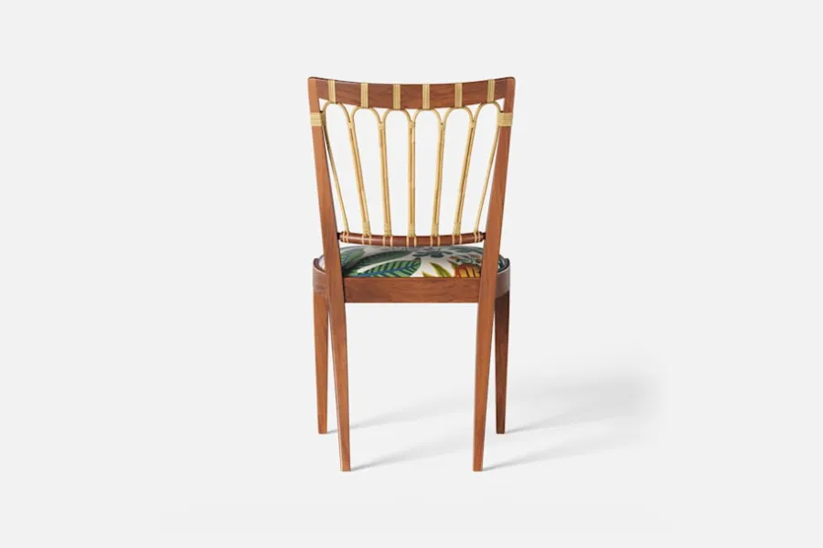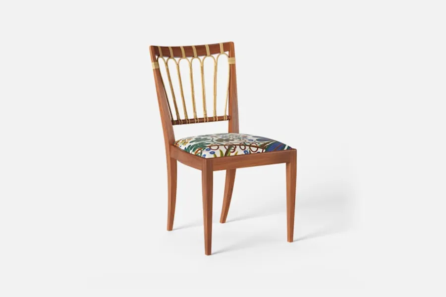 Stol 1165 har en genombruten rygg bestående av lindad rotting. För att skapa en spänning i formen valde Josef Frank ofta att blanda olika träslag och material. Stol 1165 formgavs av Josef Frank 1947.
