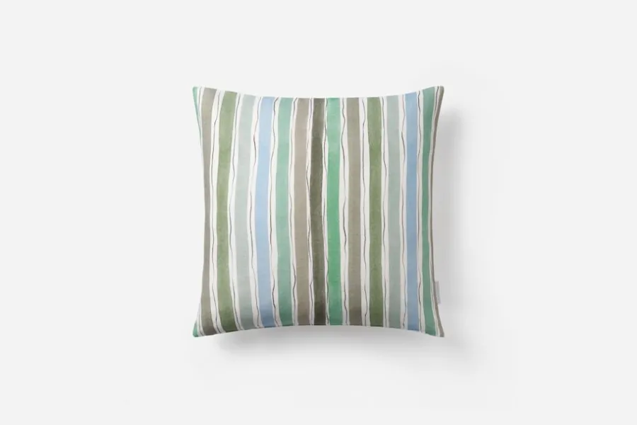 Kudde Wisteria är en del av kollektionen ”Capri”, skapad av designern Lars Nilsson för Svenskt Tenn. Textil Wisteria smyckas av målade ränder i blågröna toner, inspirerade av blommande blåregn i trädgården som omger Villa San Michele på Capri.