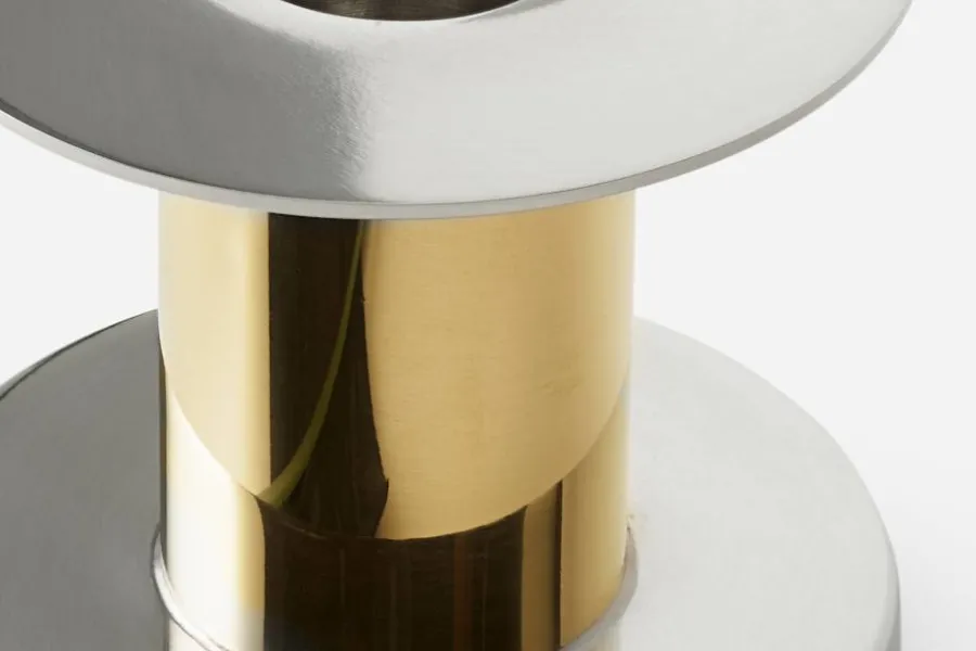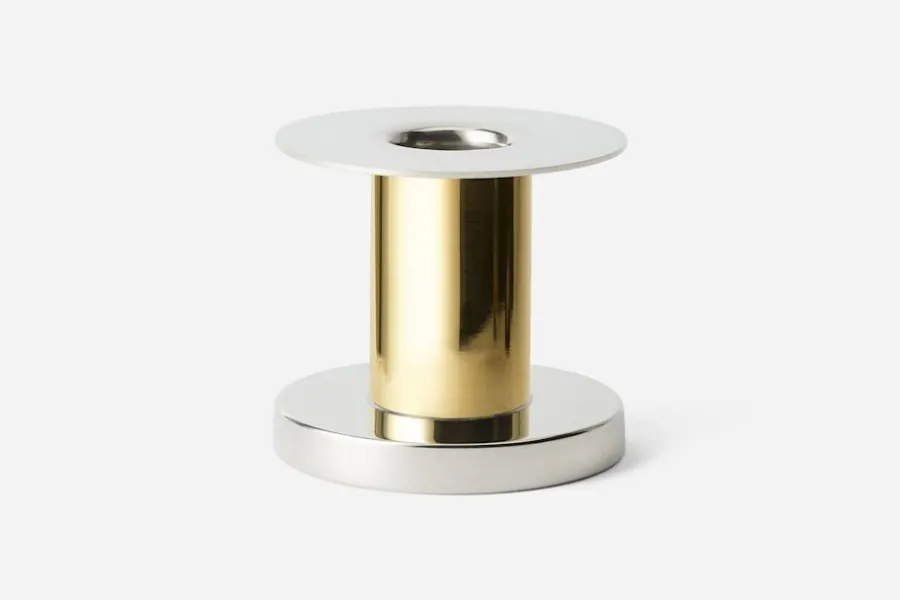 Liten ljusstake i tenn och mässing, ritad 1929-1930 av tennkonstnären Nils Fougstedt för Svenskt Tenn. Formen är tidstypiskt funktionalistisk, lika aktuell nu som då.