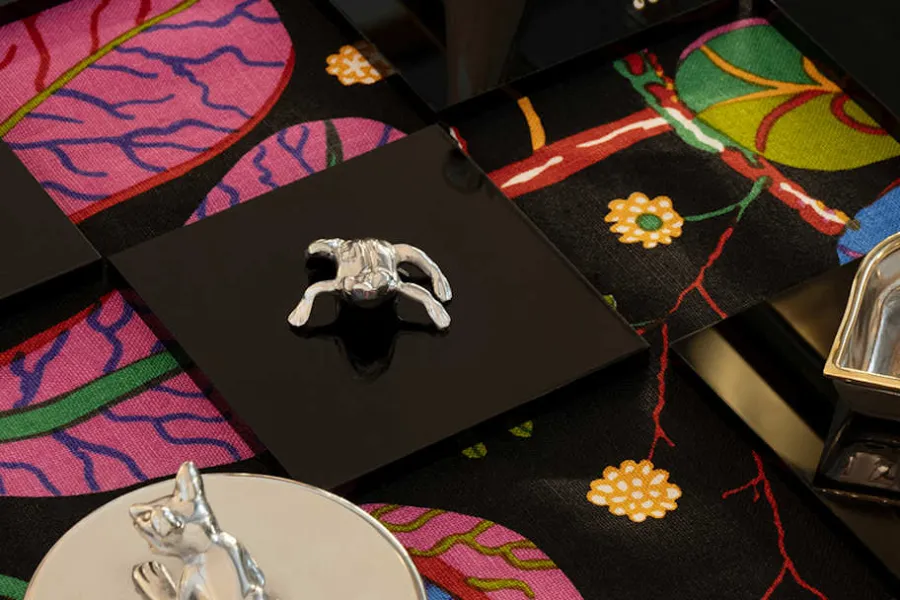 Placeringskortsgrodan i tenn är Svenskt Tenns egen design efter en förebild formgiven av Estrid Ericson, som använde den lilla grodan som bordsdekoration.
