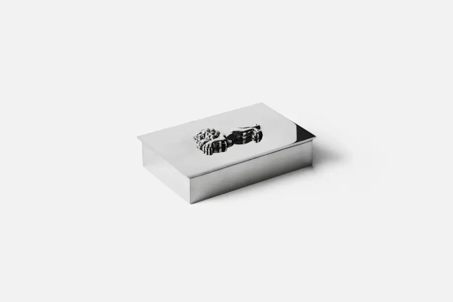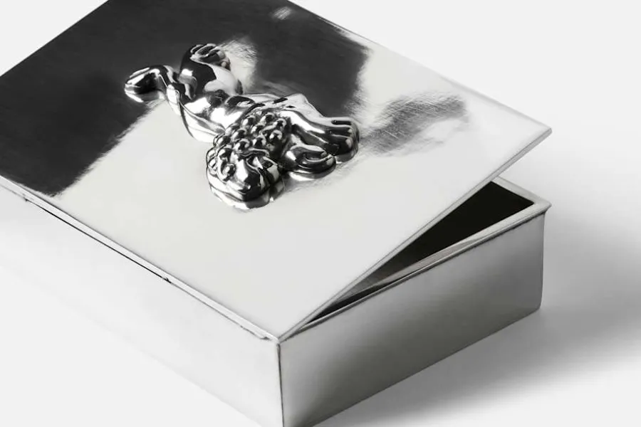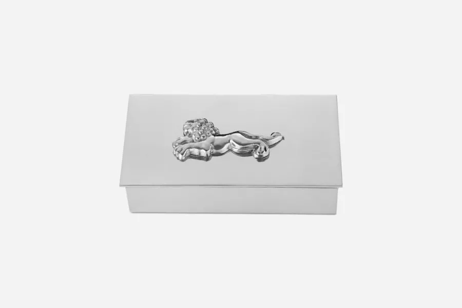 Estrid Ericson reste mycket och samlade under sina resor på sig olika slags saker och mönster. Att pryda ett föremål genom att addera ett annat objekt var något som hon gjorde ofta. Tennskrinet är dekorerat med en zebra, en elefant, en gepard eller ett lejon. Samtliga är tillverkade med inspiration från förlagor ur Estrid Ericsons arkiv.