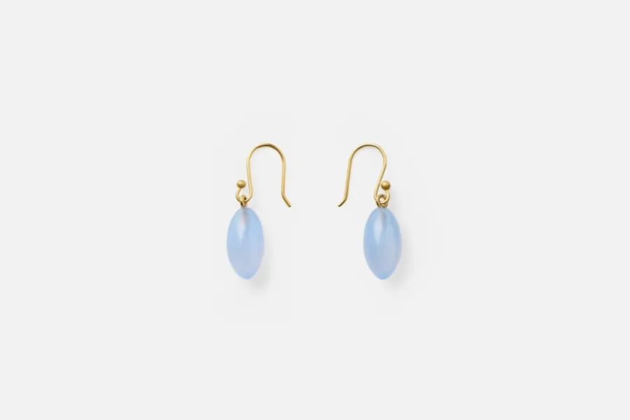 Dessa droppformade örhängen i guld med ljusblå stenpärla är formgivna av Ted Muehling. Sedan 1976 har han skapat unika smycken med naturen som inspiration, och varje par tillverkas omsorgsfullt för hand i hans studio i New York.