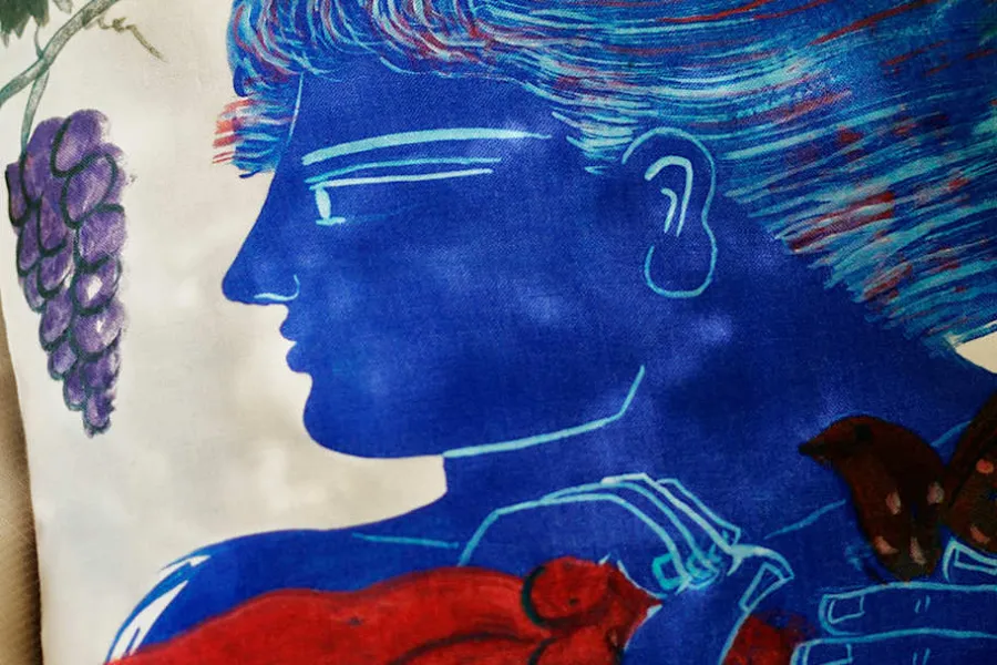 Dekorativ kudde med karaktäristiskt motiv av en gestalt i profil, skapad av den grekiske konstnären Alekos Fassianos. I sina verk skapade Fassianos ofta rörelse i motivet genom att skildra vinden som drar genom håret. I denna målning syns fler av hans återkommande motiv såsom profilen, scarfen och fågeln.