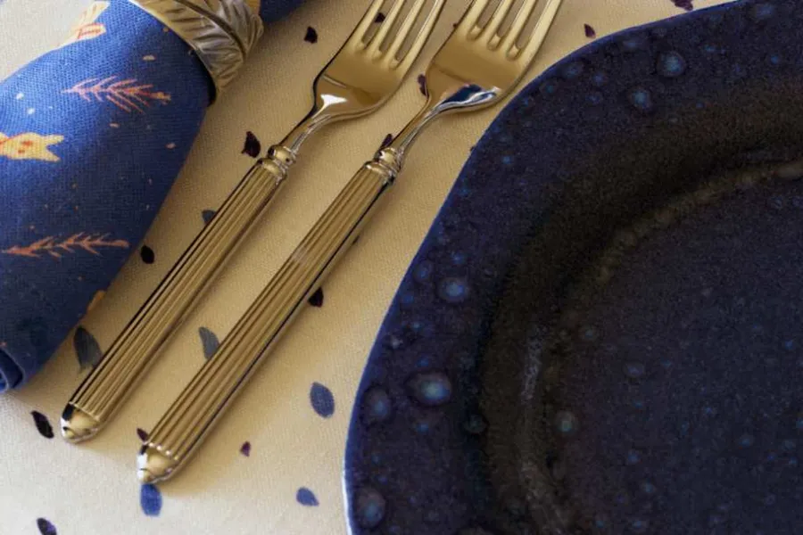 Denna dekorativa servettring i form av ett löv i tenn är skapad efter en detalj på ljusstaken av grekiske konstnären Alekos Fassianos. Ett enastående vackert inslag på det dukade bordet.