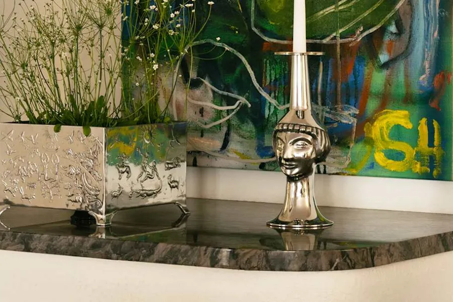 Ljusstake i tenn föreställande en Arkaisk yngling, formgiven av Anna Petrus för Svenskt Tenn 1927. I skapandet av tennljusstaken inspirerades hon bland annat av det så kallade ”Arkaiska leendet” – ett av de mest säregna dragen i grekisk konst. Det Arkaiska leendet var ett vänligt, gåtfullt leende som ofta förekom på skulpturer och djupreliefer under den Arkaiska perioden i antikens Grekland (700-480 f.Kr.), då unga flickor och ynglingar ofta användes som motiv. Anna Petrus använde sig av detta drag och skapade ynglingen i tenn både som tennljusstake, figur, vas och nåldyna. Tennljusstaken visades bland annat på utställningen Bygge och Bo på Liljevalchs Konsthall i Stockholm, 1928.