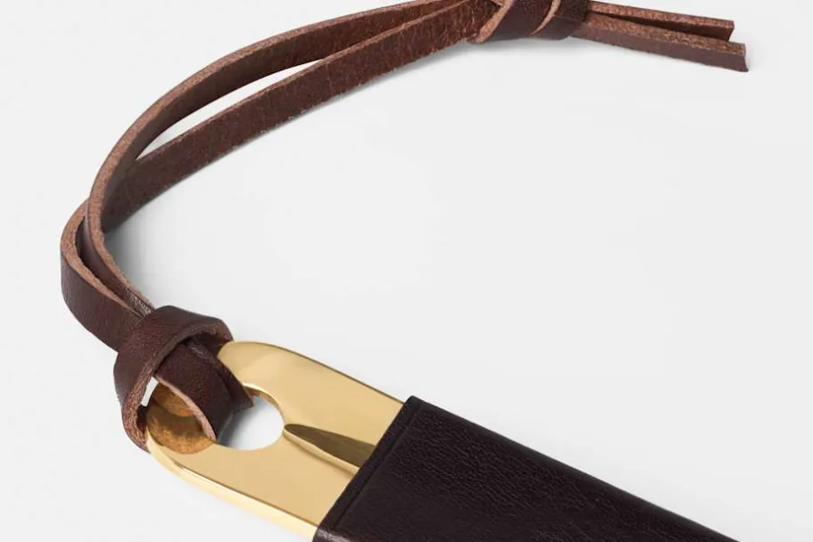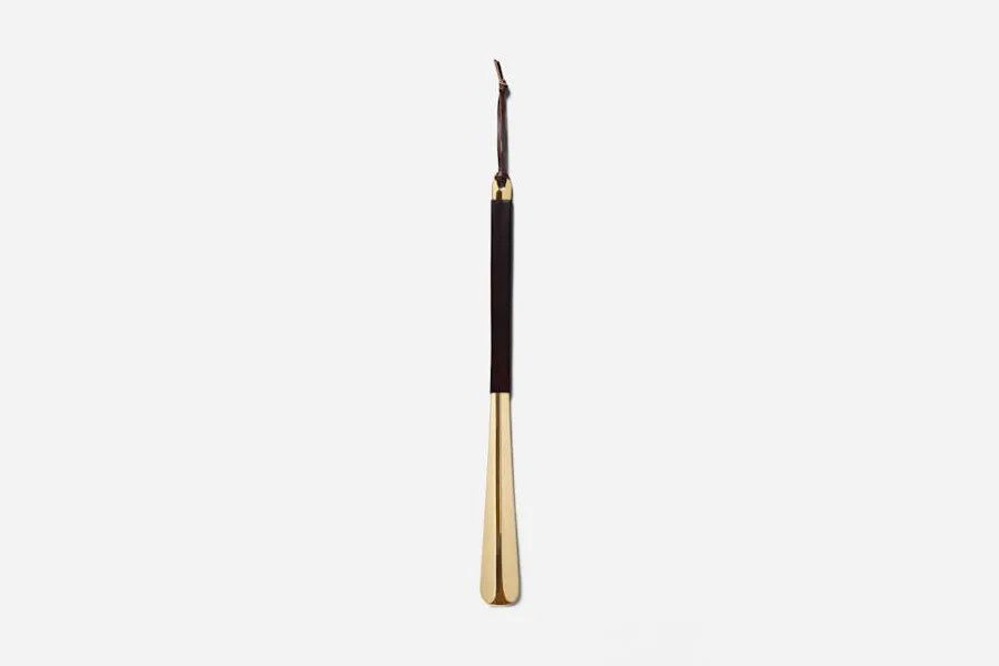 Ett skohorn i läder och mässing, formgivet av Daniel Enoksson för Svenskt Tenn. Mötet mellan det mjuka, varma lädret och den blanka mässingen som ärgas med tiden, ger skohornet en lång livslängd. Ett vackert och funktionellt föremål, skapad med tidlösa och traditionella material.