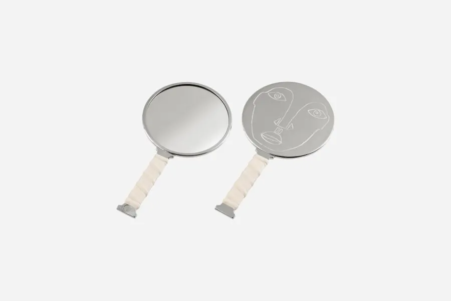 Känd som författaren till ”Brev till samhället” är Eric Ericson också verksam som konstnär och formgivare. Hans handspegel i tenn och lindat skinn är formgiven exklusivt för Svenskt Tenn 2012. Speglarna finns med fem olika motiv, självbilder, som är handgraverade på baksidan av spegeln.