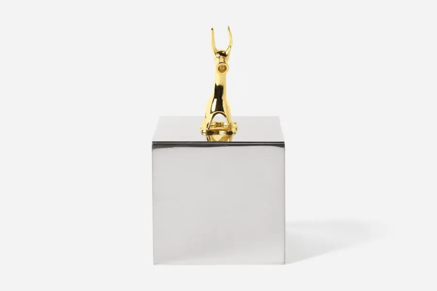 Att pryda ett föremål genom att addera ett annat var något som Estrid Ericson återkommande gjorde i sin formgivning. På denna kubformade burk har en antilop i förgyllt tenn fått kröna locket. Hon skapade den med inspiration från Östasiatiska museets samlingar, som Estrid Ericson ofta besökte. Förlagan var en kinesisk figurin i brons från Ordotiden 481 – 221 f.kr.