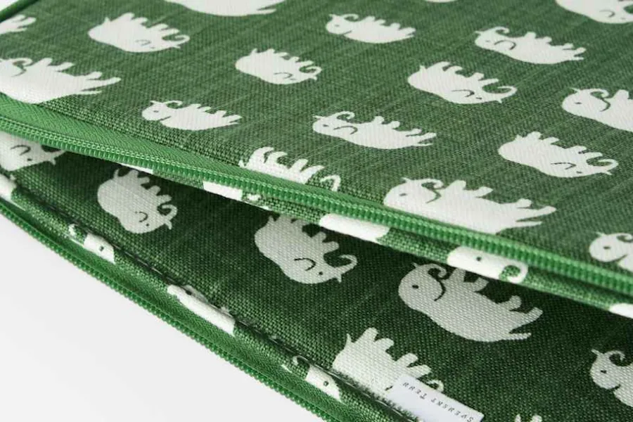 Handsytt, praktiskt och dekorativt datorfodral i Svenskt Tenns klassiska textil Elefant, formgivet av företagets grundare Estrid Ericson. Hon letade alltid efter vackra föremål, textilier och souvenirer att ta hem och sälja i butiken på Strandvägen. Det var efter en förlaga från Belgiska Kongo som hon formgav mönstret med de små elefanterna. Svenskt Tenn tryckte textil Elefant för första gången i slutet av 1930-talet. Elefantmönster