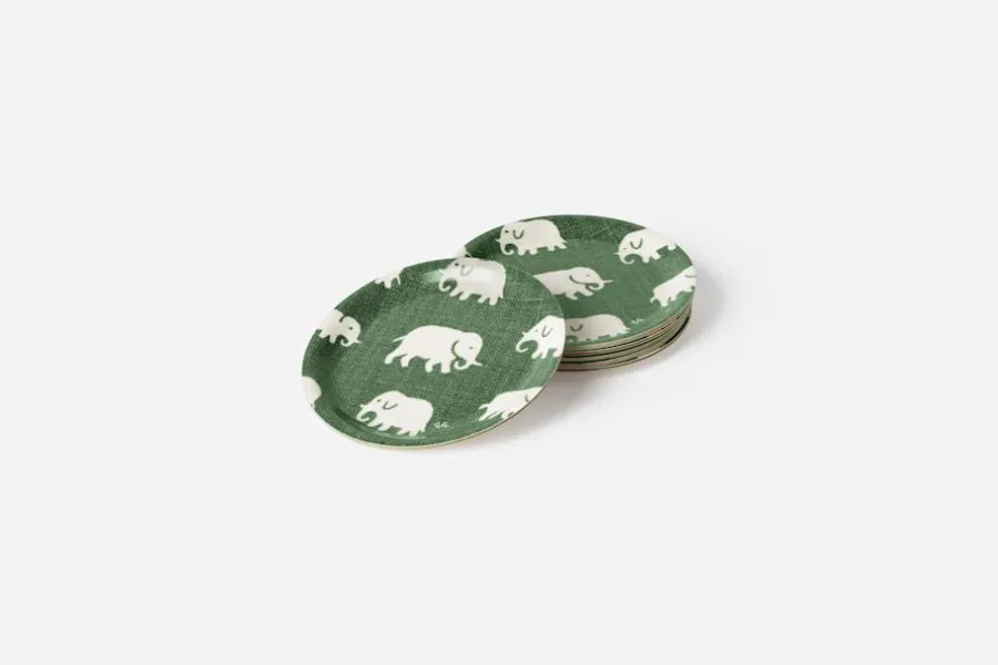 Svenskt Tenns glasunderlägg finns i flera färgstarka mönster och passar såväl till vardag som till fest. Svenskt Tenns grundare Estrid Ericson reste mycket till olika platser runt om i världen. Hon letade alltid efter vackra föremål, textilier och souvenirer att ta hem och sälja i butiken på Strandvägen. Det var efter en förlaga från Belgiska Kongo som hon formgav mönstret med de små elefanterna. Svenskt Tenn tryckte textil Elefant för första gången i slutet av 1930-talet.