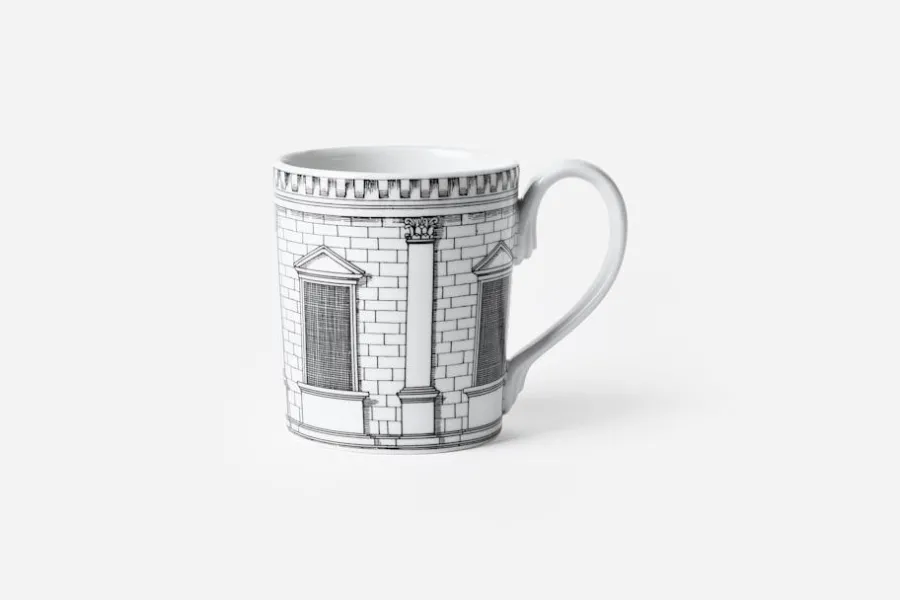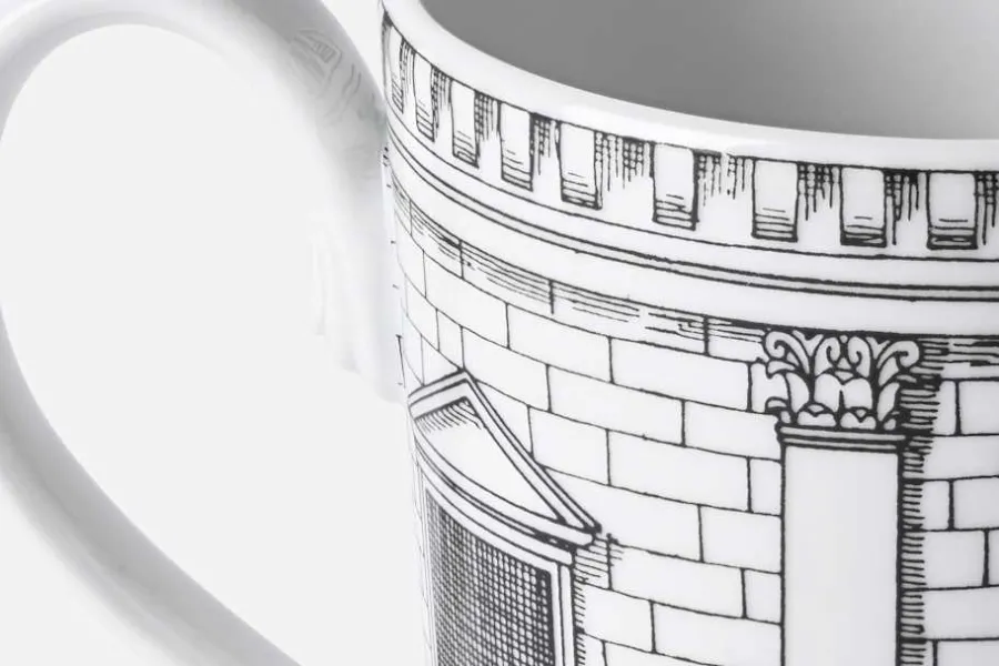 Dekorativ mugg i porslin, smyckad med Fornasettis karaktäristiska mönster Architettura; en vacker illustration av en arkitektonisk byggnad i svartvit design. Samtliga Fornasettis kreationer, från möbler till inredningsdetaljer, tillverkas för hand i Italien. I företagets ateljé arbetar skickliga hantverkare med samma tekniker som användes när de allra första produkterna togs fram. Färgen appliceras för hand med utgångspunkt i originalmönstren.