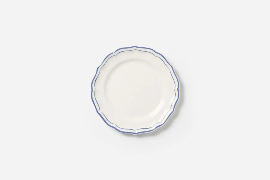 En enkel, klassisk och elegant middagsservis från franska Gien. Den skira blåa kantlinjen är handmålad på varje porslinsföremål.