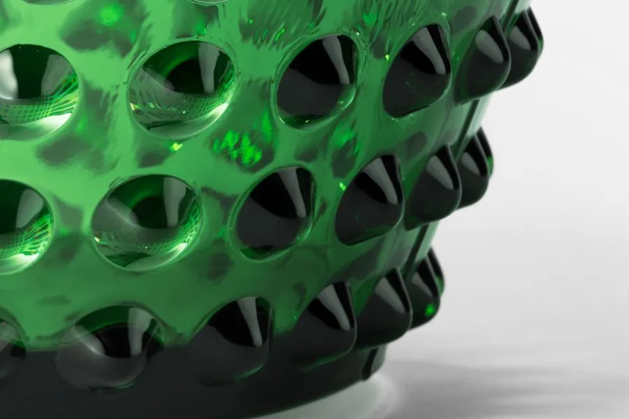 Jardinjären har en tunn skarv i glaset som uppkommer då den är pressad i en delbar gjutform. Den poleras i efterbearbetningen, men spår av den hantverksmässiga produktionen finns alltid kvar på slutprodukten.