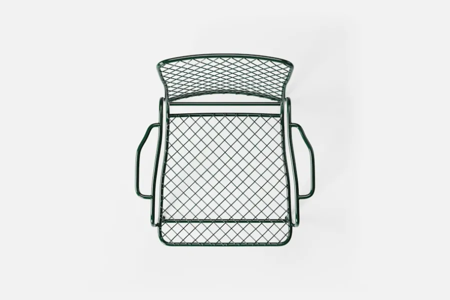 Trädgårdsmöbeln i lackerat järn med genombruten nätdekor i rygg och sits formgavs Josef Frank i mitten av 1930-talet. Den här typen av stålrörsmöbler var populära inom den funktionalistiska stilen som gjort sitt intåg i Sverige. I karmstol 591 har Josef Frank bytt ut det då ofta förekommande kromet mot den varma lackfärgen.