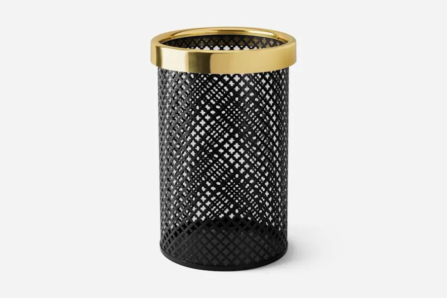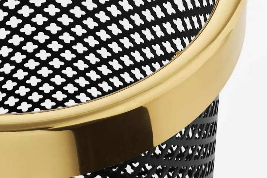 Mönstret på denna papperskorg är inspirerat av den historiska gotiska fyrpassformen, men här har Josef Frank istället för relief utstansat hål i cylinderns plåt. Typiskt för Josef Franks formgivning är också blandningen av material: kroppens lackerade plåt mot överkantens blankpolerade mässingsram.