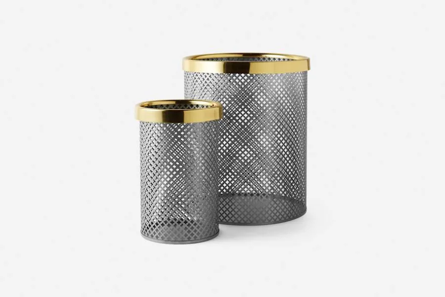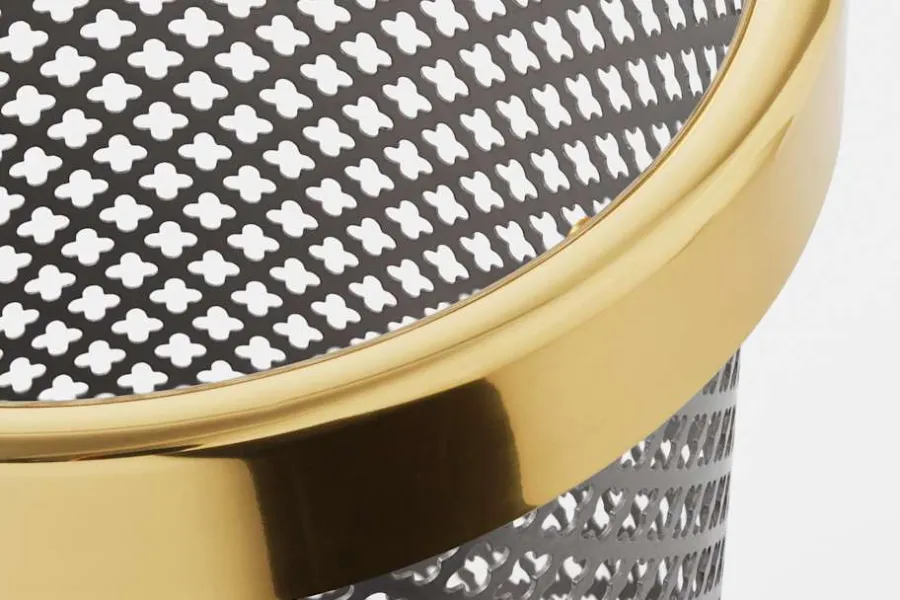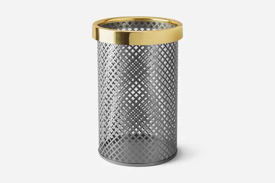 Mönstret på denna papperskorg är inspirerat av den historiska gotiska fyrpassformen, men här har Josef Frank istället för relief utstansat hål i cylinderns plåt. Typiskt för Josef Franks formgivning är också blandningen av material: kroppens lackerade plåt mot överkantens blankpolerade mässingsram.