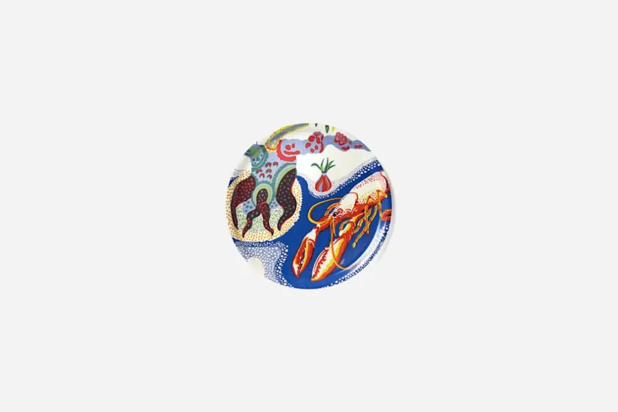 Grönsaksplantor från Italien var otvetydigt Josef Franks inspiration till mönstret Italian Dinner. Stammar, blad och fruktformer bildar vertikala stråk med en olivkvist i centrum. Horisontella vattendrag med gulstrimmig mullus, bläckfisk, musslor och hummer balanserar kompositionen. Josef Frank formgav mönstret under 1943-1945. Svenskt Tenns klassiska brickor i björkfaner finns i flera färgstarka mönster av Josef Frank, bland annat Italian Dinner.