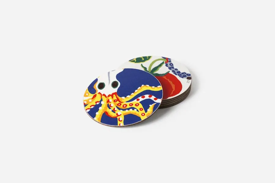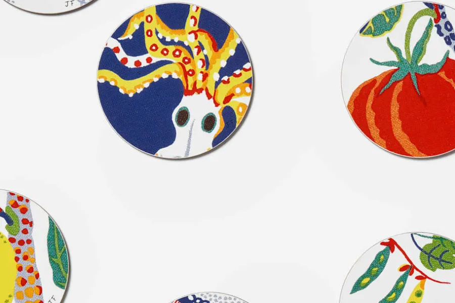 Svenskt Tenns glasunderlägg finns i flera av Josef Franks färgstarka mönster och passar såväl till vardag som till fest. Underläggen säljs i 6-pack. Grönsaksplantor från Italien var otvetydigt Josef Franks inspiration till mönstret Italian Dinner. Stammar, blad och fruktformer bildar vertikala stråk med en olivkvist i centrum. Horisontella vattendrag med gulstrimmig mullus, bläckfisk, musslor och hummer balanserar kompositionen. Josef Frank formgav mönstret under 1943-1945.