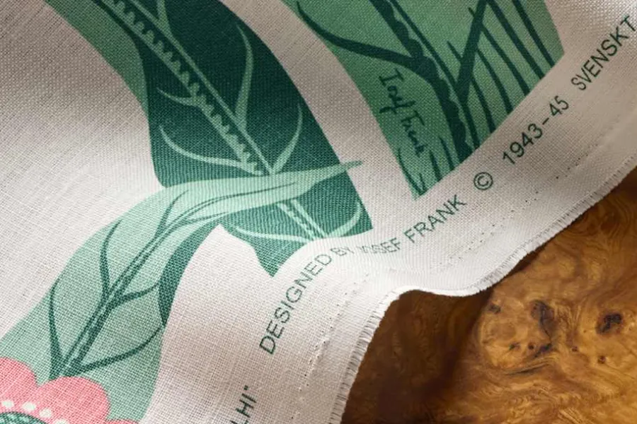 Jättelika bladbågar välver sig över blekrosa blomkorgar och ett romantiskt skimmer av fjärilar anas bland bladverken. Josef Frank formgav den stormönstrade textilen Delhi under sin tid i New York 1943-1945. Av många upplevdes mönsterstorleken som främmande, trots att formgivaren William Morris redan framhållit: ”Var inte rädd för stora mönster; med rätt design är de mer harmoniska för ögat att se på än de små.”