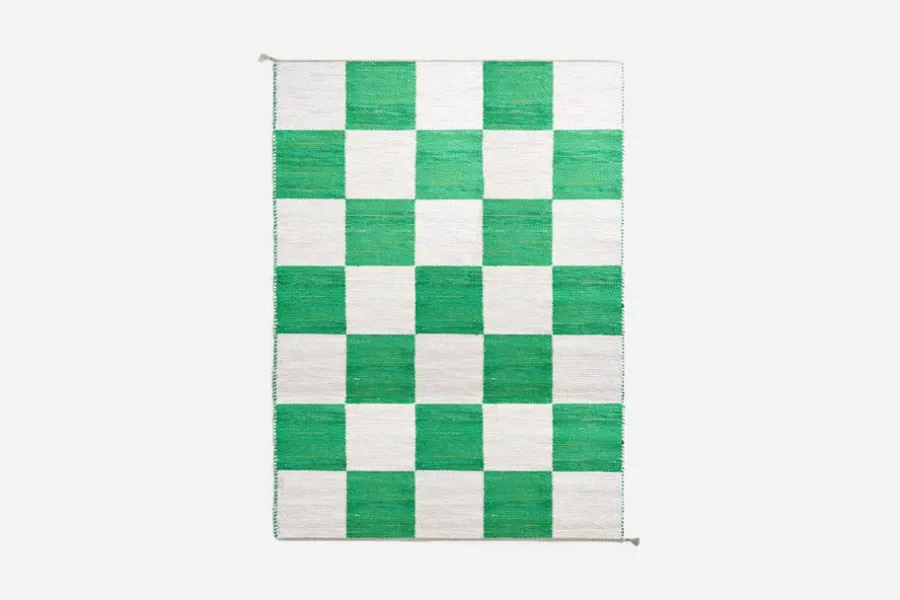Svenskt Tenns dubbelvävda trasmatta ”Schackrutan” är formgiven av Margit Thorén under 1940-talet.