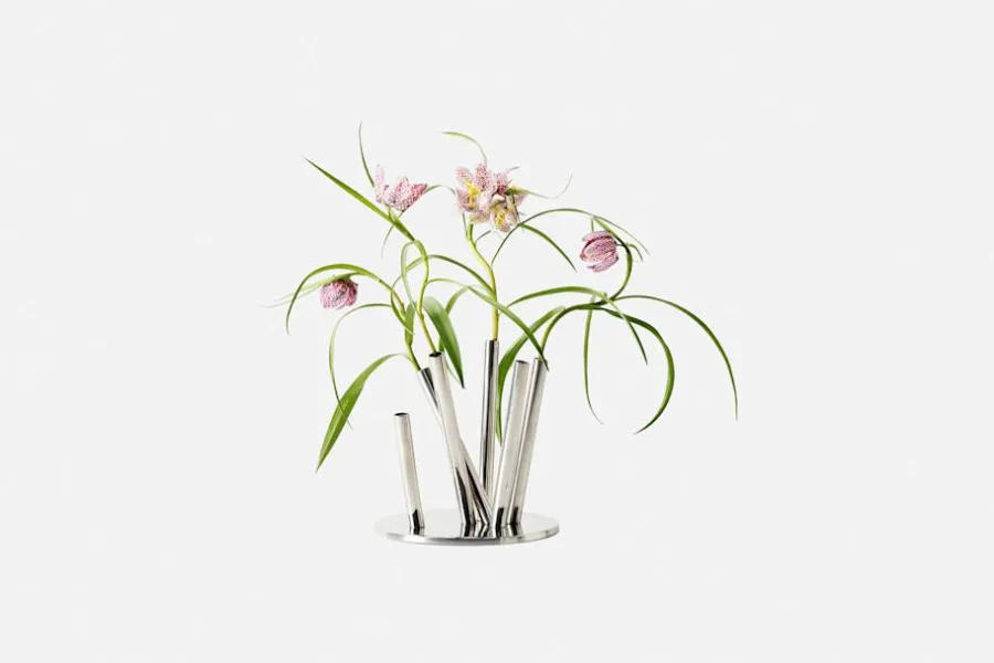 Med sina utstickande pipor sätter sig blommorna vackert i förhållande till varandra, vilket säkert var den tidiga funktionalistformgivaren Nils Fougstedts tanke när han formgav vasen i tenn. Uttrycket känns modernt trots att den formgavs redan 1931.