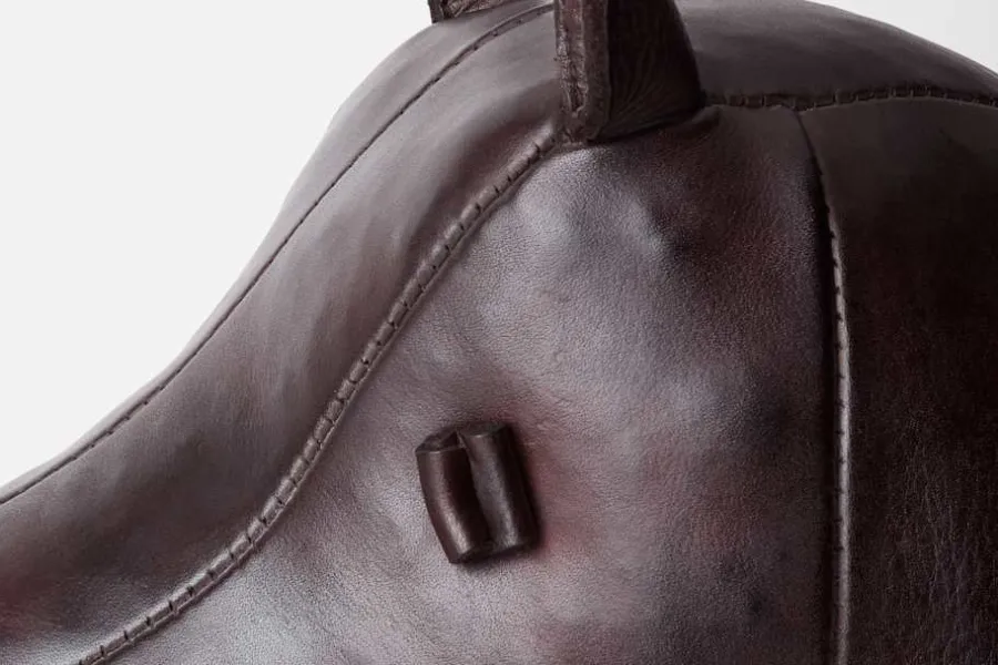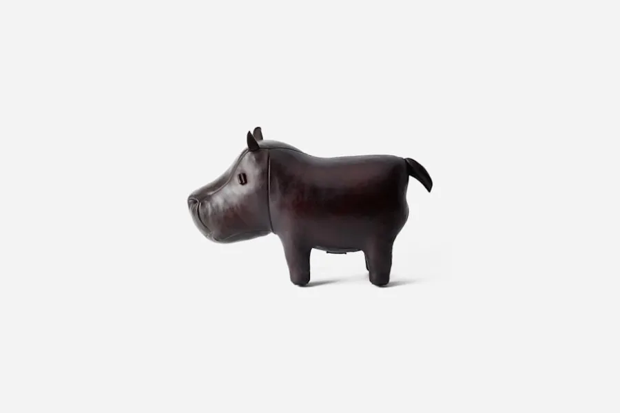 Flodhästen i skinn kan användas som fotpall eller som inredningsdetalj i hemmet. Den har mjuka, runda former och ett leende som gör den till en underfundig och oemotståndlig detalj i interiören. Flodhästen är tillverkad av engelska Omersa, som grundades i London 1927. Det mjuka skinnet är färgat för hand till en djup, mahognybrun ton och har därefter vaxats och polerats för att skapa en elegant finish.