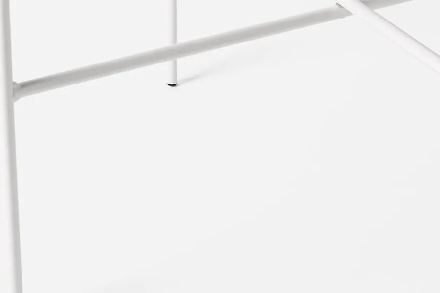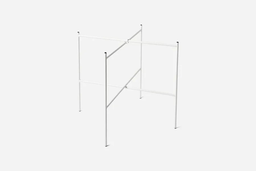 Lackerat stål med plastfötter som skydd nedtill och stöd för bricka upptill.