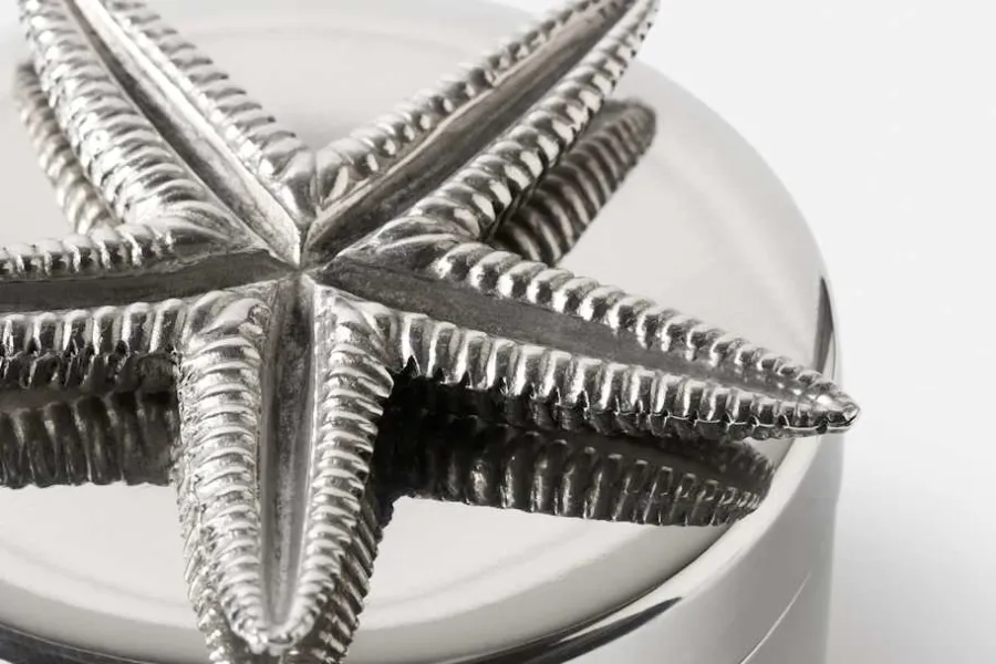 Estrid Ericson reste mycket och samlade under sina resor på sig olika slags saker och mönster. Att pryda ett föremål genom att addera ett annat objekt, var något som Estrid Ericson ofta gjorde. De små burkarna i tenn med figurer på locket är Svenskt Tenns egen design. Burkarna finns i tre olika storlekar och pryds med en delfin, en sjöstjärna eller en snäcka.