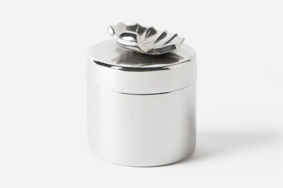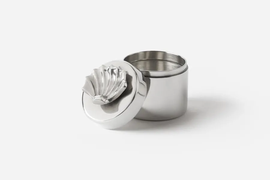 Estrid Ericson reste mycket och samlade under sina resor på sig olika slags saker och mönster. Att pryda ett föremål genom att addera ett annat objekt, var något som Estrid Ericson ofta gjorde. De små burkarna i tenn med figurer på locket är Svenskt Tenns egen design. Burkarna finns i tre olika storlekar och pryds med en delifn, en sjöstjärna eller en snäcka.